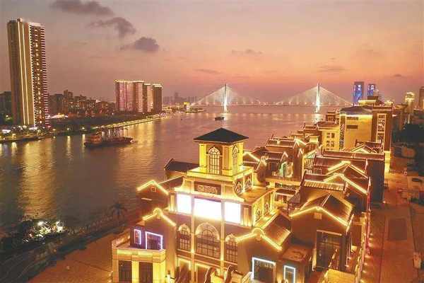 隔着海甸溪遥望对面的海口东坡老码头风情商业街,古典雅致的建筑错落有致,深灰色的墙衣搭配富有年代感的瓦片,在璀璨的霓虹映照下,仿佛穿越回曾经繁荣的老码头。
