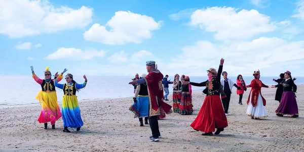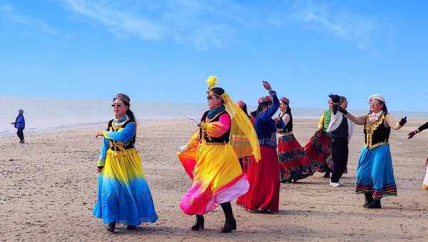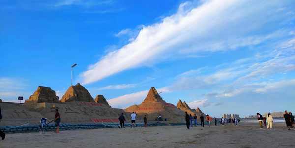 我们本来想去看祭海,结果走错了方向,遇到一群载歌载舞的维吾尔族人。他们在海边尽情地舞蹈,歌唱,他们绚丽多彩的民族服饰,美丽无比;他们自由自在的舞姿,为这大海增添了无限的生机和活力。
