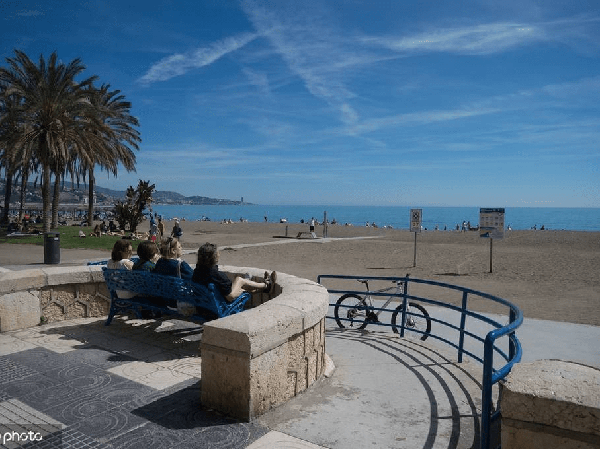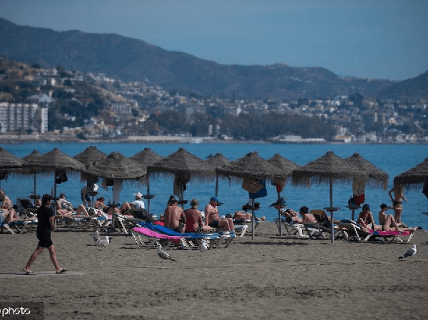 西班牙马拉加春季阳光明媚,游客聚集海滩沐浴。