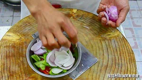 洋葱去皮,改刀切成三角片,用手抓散,和青红椒放在一起。