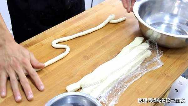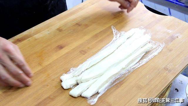 4.把饧发好的长条放到案板上反复揉搓,搓成粗细大小均匀的圆条。
