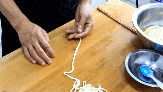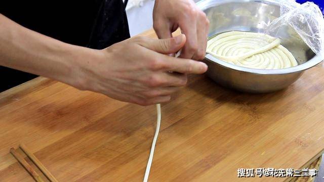 6.饧发好后,我们拿起圆条的一头夹在虎口处,然后向外拉伸拉成比较细的面条,用力不要过大以免扯断。