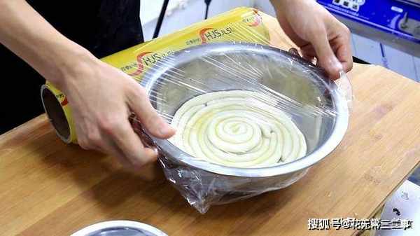 5.准备一个小盆,在盆的底部刷上植物油,把揉搓好的圆条依次盘入盆中,最后在刷上植物油,盖上保鲜膜饧发30分钟。