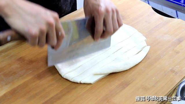 2.面团饧发好后,取出面团放到案板上,用擀面杖把面团压成薄片,然后用刀切成1cm左右的长条。