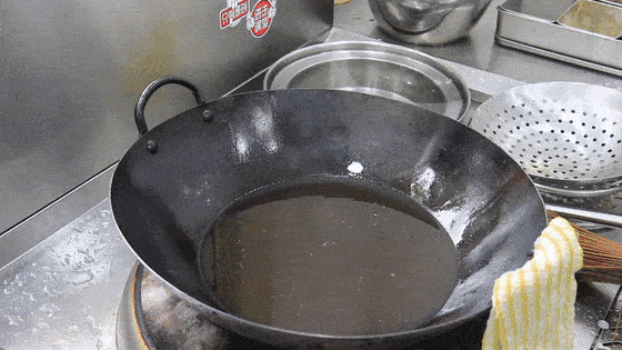 8.锅内烧油,油温烧至7成热后,把盘好的馓胚慢慢的放入油锅中,先把馓胚的一头炸制定型后,在抽出筷子。