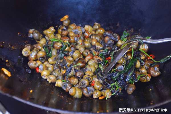 3、石螺肉脱壳后加入食盐、生抽、蚝油、大火翻炒均匀,加半碗清水盖上盖子,小火焖煮一会儿,彻底煮熟后后放入紫苏叶,大火翻炒收汁,汤汁浓郁后即可出锅。