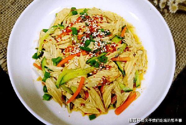 2、把焯过水的腐竹、胡萝卜丝放入大盆中,再放入黄瓜丝。蒜瓣切末,香葱切葱花,再放一勺白芝麻,放在菜上用热油泼出香味,加入食盐、生抽、老抽、蚝油、辣椒油拌匀即可。