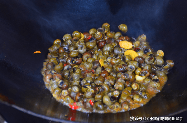 2、起锅烧油,放入姜蒜、小米椒炝锅,加一勺豆瓣酱炒出红油,倒入洗干净的石螺,大火爆炒3分钟,淋入适量料酒翻炒去腥。