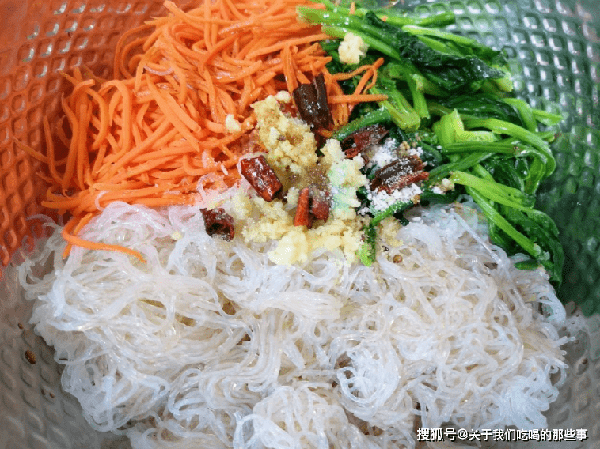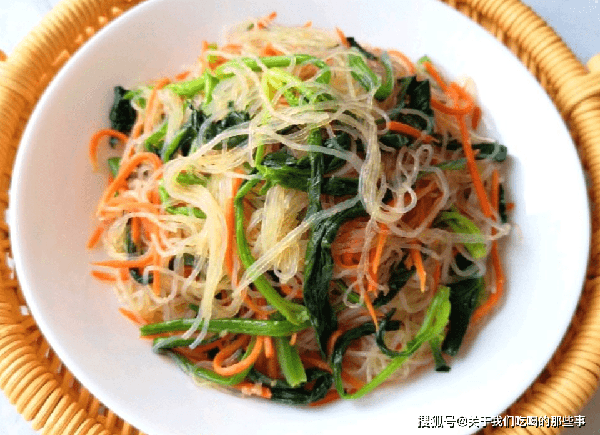 1、菠菜摘洗干净,粉丝用水泡软,胡萝卜去皮后刨成细丝。烧一锅开水,放入粉丝煮2分钟,变软后捞出过凉水,沥干水分。再放入胡萝卜丝煮半分钟,捞出过凉水,沥干水分。