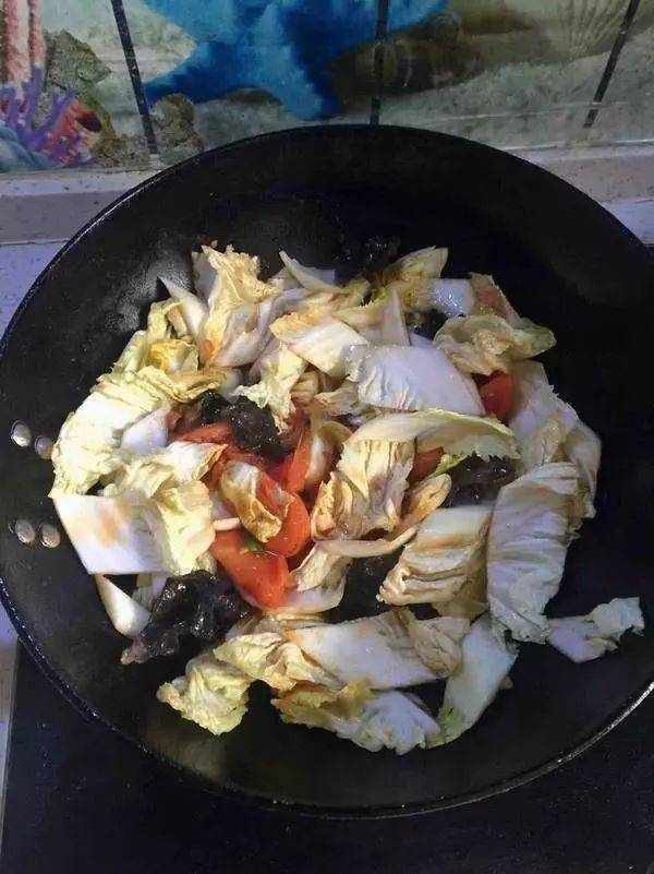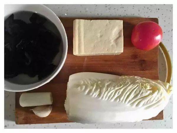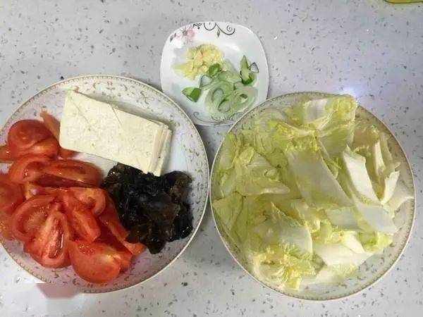 2. 白菜和豆腐切菱形,西红柿切块,我用了2个西红柿,木耳泡发撕小朵,葱蒜切片。
