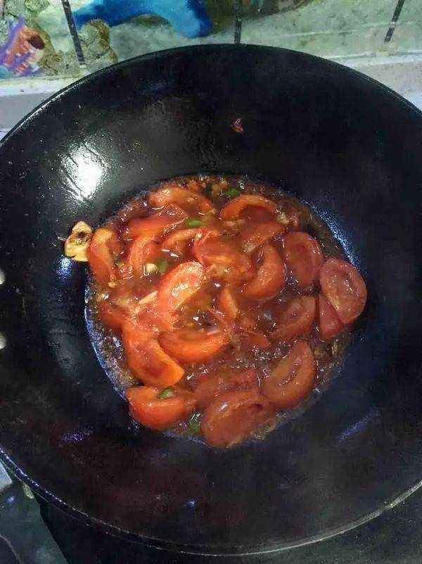 4. 放入西红柿爆炒,加1勺生抽半勺蚝油调味。
