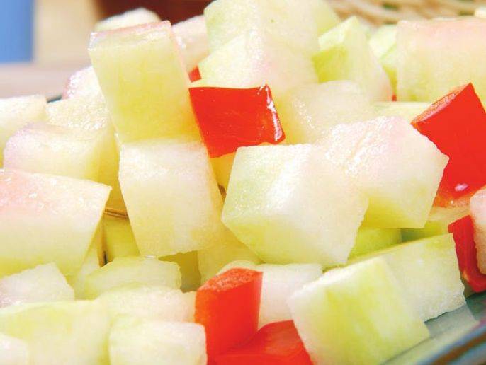 制作步骤:1 、将西瓜皮的翠绿色外皮和靠近瓤的白色软层削去,只取靠外皮的浅绿色一层。