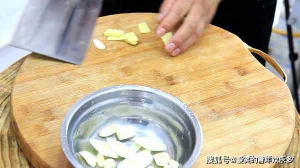 大蒜几粒切成蒜片,大葱白一小段,切成马蹄片,生姜一小块,切成姜片,与葱蒜放在一起 。