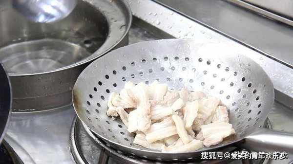 我们先把五花肉焯一下水,锅内烧水,凉水放入五花肉片,加入食盐2克,料酒3克,食盐用来入底味 ,把肉片中的油煮出来,打去漂浮在上面的浮沫,捞出用清水冲洗控干水分。