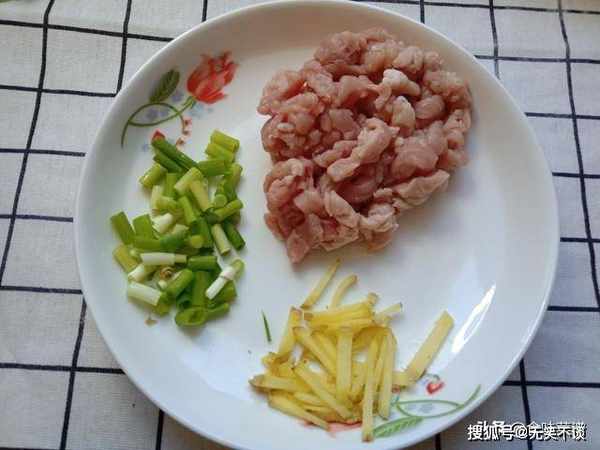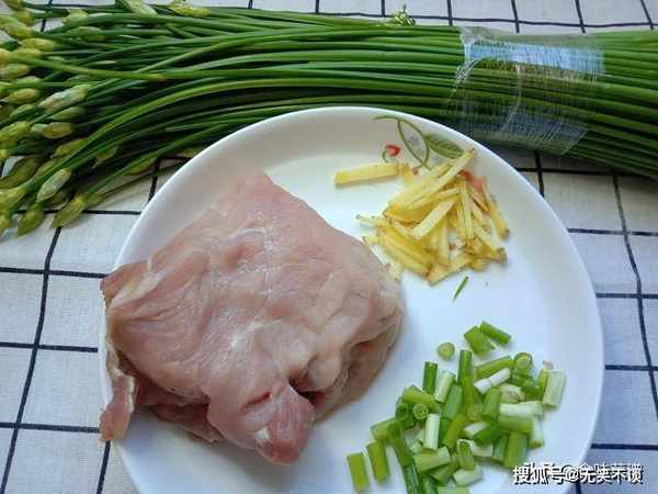 1、准备韭苔一把,约2元钱足够,适量姜丝、葱花,一块儿瘦肉,现在猪肉涨价了,更要对得起自己。