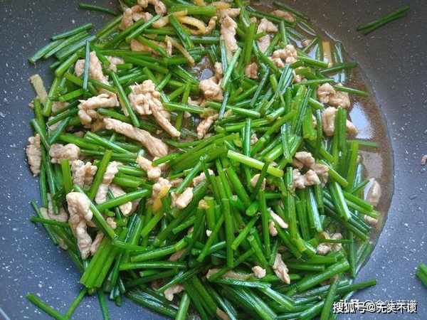 6、肉变色后,放入韭苔,炒至断生后,放入调味盐、鸡精,即可出锅。