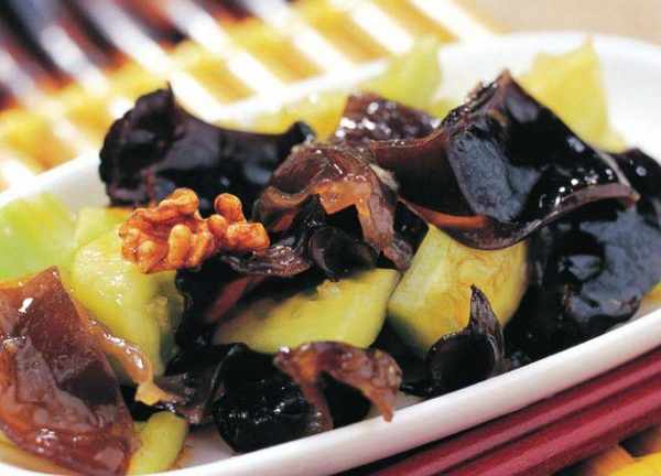 材料:黑木耳30克,黄瓜、核桃仁各50克,精盐、白糖、生抽各1/2小匙,橄榄油、蒜蓉汁、香醋、植物油各1小匙。