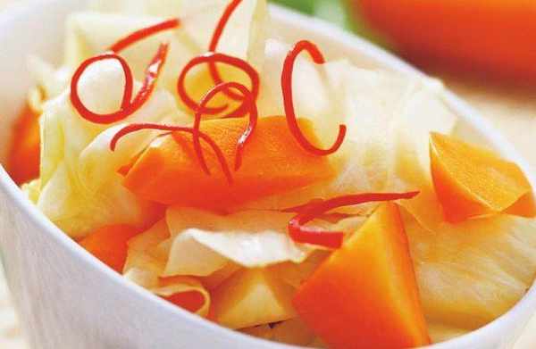 制作步骤:1 、将白萝卜、胡萝卜、白菜分别洗净,均切成块,加入精盐拌匀,腌4小时。