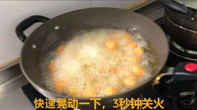 快速放入丸子,3秒钟关火,均匀的炸到金黄色,捞出完成,