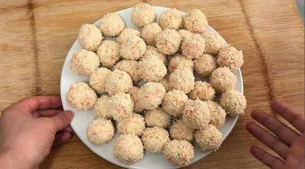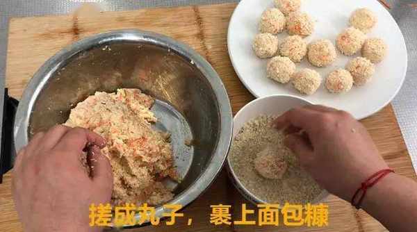 把胡萝卜豆腐搓成大小相等的丸子,裹上面包糠,装盘备用,
