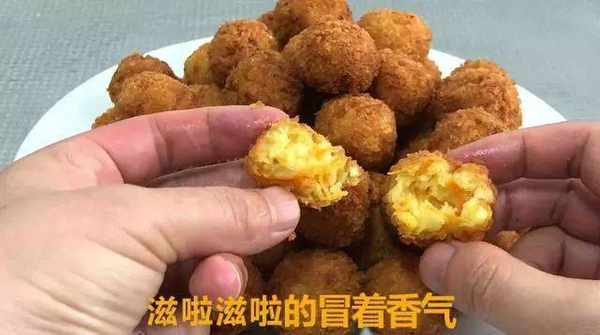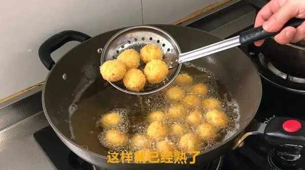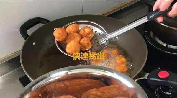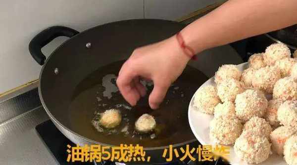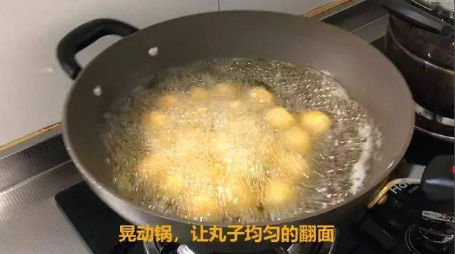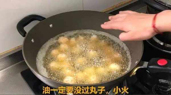 油锅加热,5成热放入丸子,慢火煎炸,(油要没过丸子,一定要慢火)中间晃动锅,让丸子均匀的反面,
