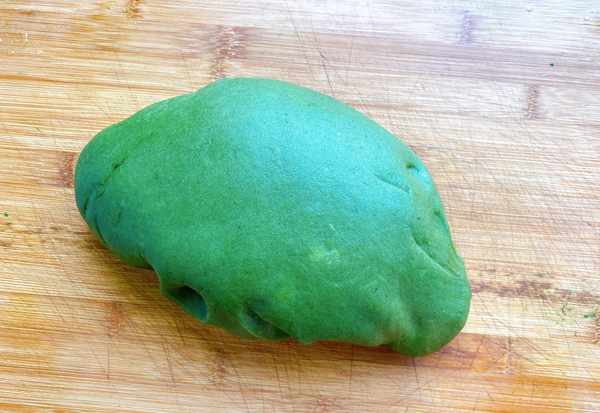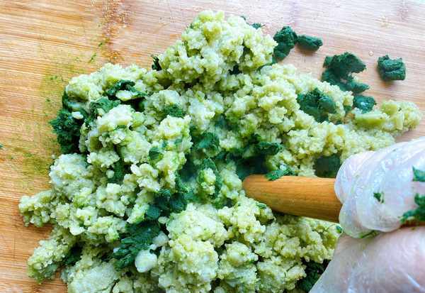 9、面团和艾草渣渣都蒸好之后,倒扣在案板上,趁热把它们揉在一起,刚开始很烫,可以用擀面杖帮忙,或者是戴上烘焙手套,边揉边蘸一下冷水,让它们完全融合在一起,这样颜色翠绿且柔软的青团皮就完成了,揉好的青团面皮还是热的,揉好的青团皮就能直接吃了,或者是包上准备好的馅料,这是一个万能的青团皮;