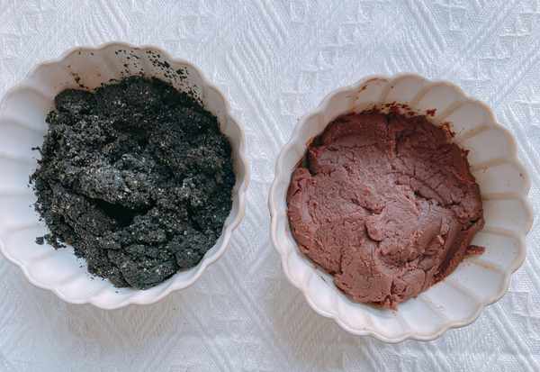 10、准备的是甜口的豆沙馅和黑芝麻馅,豆沙是现成的熟豆沙,做法之前和大家分享过,有需要的朋友可以去看看,黑芝麻馅是自己临时做的,200g熟黑芝麻+100g红糖,放在料理机中搅打3-5秒,不要完全打碎,黑芝麻有些颗粒感会更好吃,这样面团和馅料都是熟的,那包好的青团也就能直接吃了;