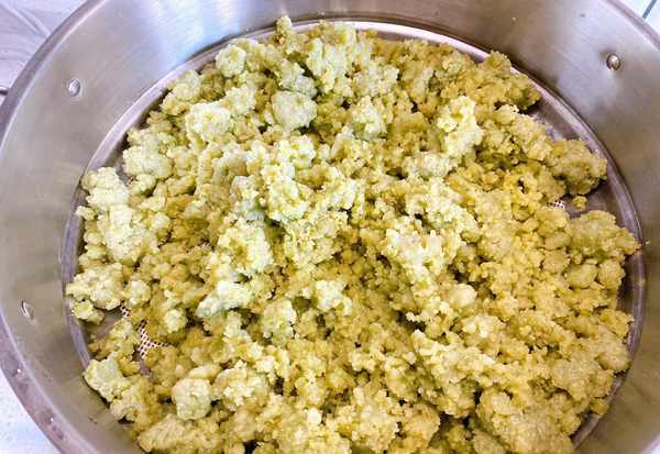 8、揉好的粉铺在蒸屉上,铺的稍微薄一些,冷水上锅蒸,水开再蒸10-13分钟,快要蒸好的前3分钟,把刚刚过滤出来的艾草渣渣放上去蒸,平铺在蒸屉上,这样更容易蒸熟,艾草渣渣蒸的时间不能太久,最多3分钟,因为艾草在焯水的时候就已经煮熟了,不用担心蒸不熟,蒸的时间久了颜色会发黄,这样蒸好的艾草渣渣的颜色是翠绿翠绿的;