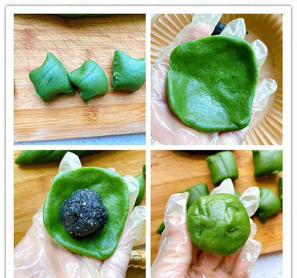 11、面皮取25g一个,馅料大约20g,取一个面皮,将它压扁,包上馅料,团圆,青团完成;