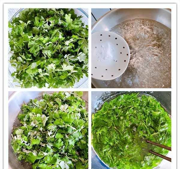 3、剩下的艾草大约有400g,新鲜艾草的重量决定了小苏打的用量,500g左右大约用2g食用小苏打,锅中水烧开,加入小苏打,下入艾草,大火煮开再煮2-3分钟,把艾草煮软,煮软之后把艾草捞出来放在冷水中过凉,快速降温能保证艾草颜色是翠绿的,完全过凉之后把艾草捞出来,挤干水分;