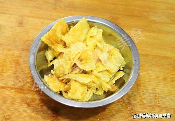 3.煎鸡蛋饼:锅内烧油,充分滑锅以后倒出热油加入凉油,热锅凉油煎鸡蛋饼时不易粘锅,把鸡蛋液倒入锅中,用勺子推动鸡蛋摊成圆形的蛋饼,煎至鸡蛋液全部定型后颠锅翻面,大约煎2分钟,蛋饼两面呈金黄色时倒出控油,把蛋饼放在案板上,切成均匀小块备用。