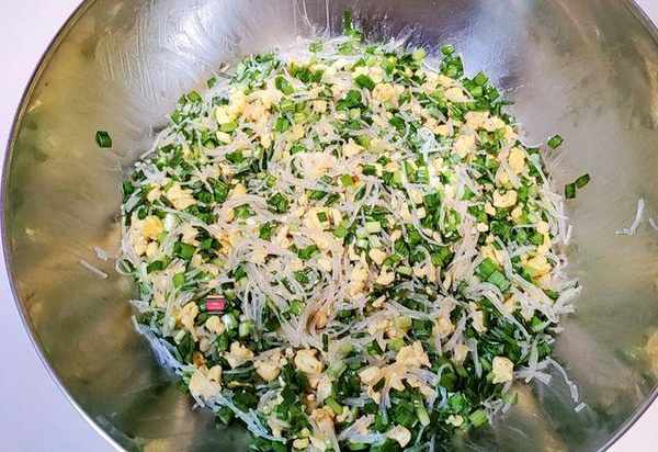 5、将准备好的鸡蛋和粉丝倒入韭菜中,再加入生抽、五香粉、蚝油、盐、糖调味,所有食材一起搅拌均匀,馅料就准备好了。