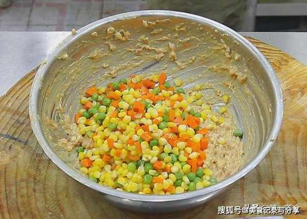 锅内烧水,水快烧开时,把胡萝卜粒,玉米粒,青豆焯水2分钟,捞出后用凉水冲洗,控干水分。
