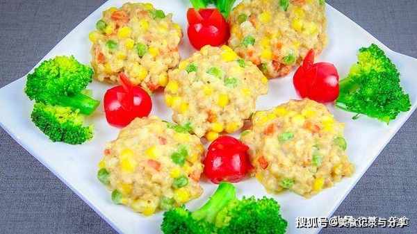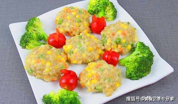 西兰花用开水烫1分钟,摆在盘中点缀,然后,再把肉饼摆在盘中。