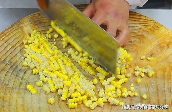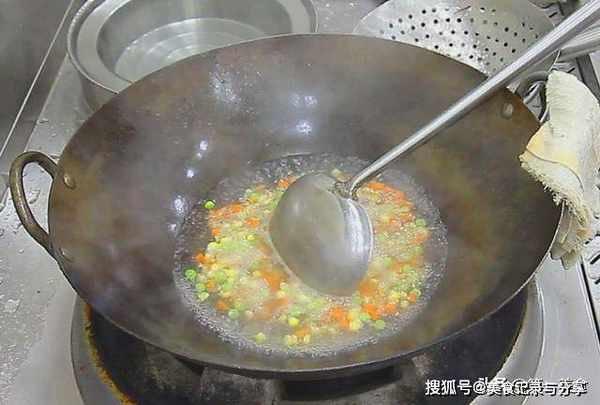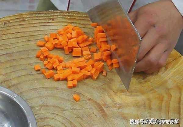 准备青豆一把,放盆里备用,胡萝卜一个,也是先切片,再切丝,最后切成碎粒。