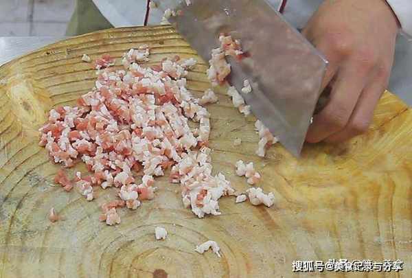 准备一块五花肉,先切成片,再切成丝,最后再切成颗粒,放于盘中。