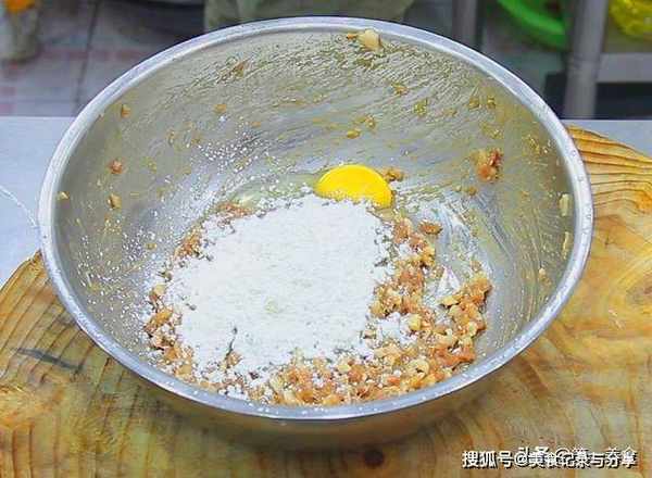 搅拌摔打,让肉馅充分吸收调料,搅拌摔打大概3分钟左右,加入一个鸡蛋,一小把淀粉,顺着一个方向继续快速搅拌。