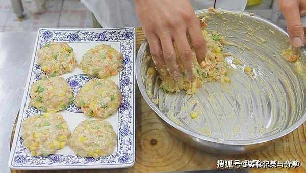 ,用手把肉馅依次团好,团成厚一点的饼状摆放在盘里。