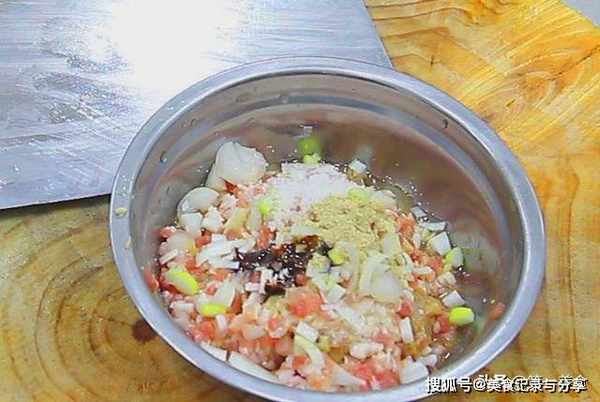葱白切成葱花,和肉沫放在一个盆中, 加入料酒,食盐,胡椒粉,老抽,用手抓匀后,倒入一个大一点的盆中。