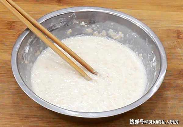 2.准备燕麦片200克,加入纯牛奶100毫升,面粉30克,面粉主要用来增加粘性,不需要太多,搅拌至没有干面粉,再加入100毫升的清水,调成稀一些的面糊备用。
