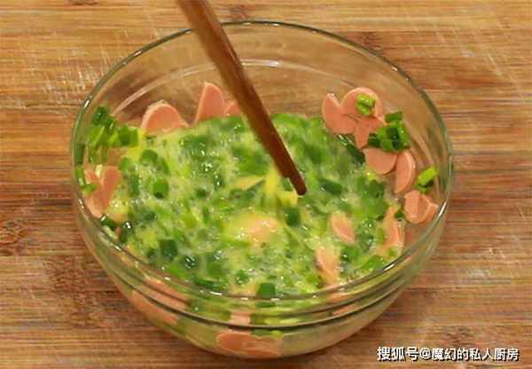1.碗中打入三个鸡蛋,切点葱花、火腿片放入碗中,加入食盐2克,搅拌均匀备用。