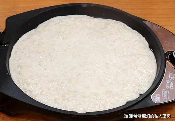 3.起锅开小火,均匀刷上植物油,油温五成热时把面糊倒入锅中,用勺子摊成薄厚均匀的圆形面饼,盖上锅盖烙2分钟。