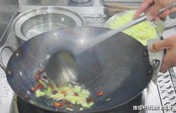 下面,我们开始烹饪。粉条很容易粘锅,一定要用油充分滑锅。锅里倒油,充分滑锅,油冒青烟后倒出,再加入凉油。倒入葱蒜红干椒,快速翻炒出香味。