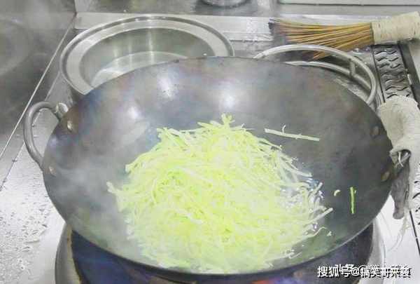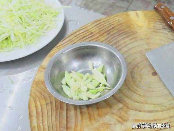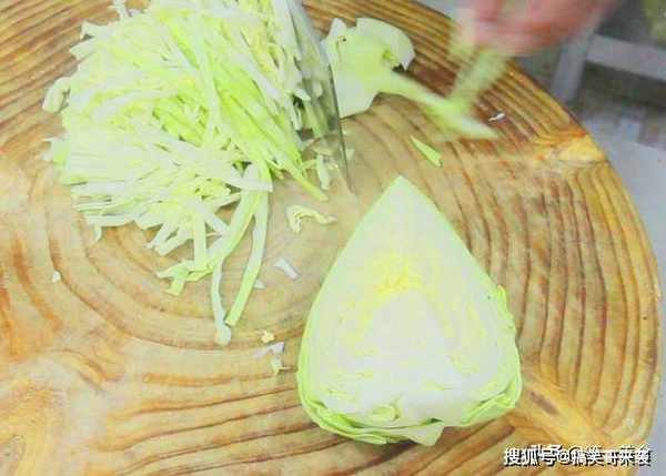 首先,准备小包菜一个,这里我们只用一半,切去根部,然后切成细丝,把包菜丝放在盘中备用。