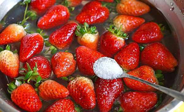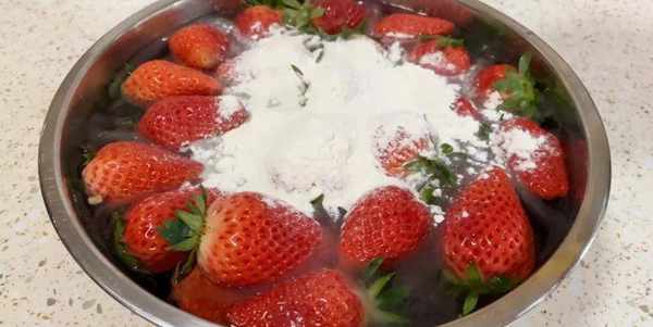 挑拣好的草莓,我们一个个轻放到刚才准备的大盆中,然后在往盆中加入适量的小苏打和面粉,食用盐,在加入适量的清水在盆中浸泡上10分钟。小苏打有很强的清洁能力,可以将草莓上的农药残留一起给清出来,而我们的面粉有着很强的吸附能力,像草莓中的细小污渍和杂质可以一起吸附出来,还有我们的食用盐,大家都知道有很好的去菌作用,这样可以将其草莓清洗得很干净,这样我们在食用的时候,也很放心,所以在三者加在一起,可以将草莓清洗得更干净,而不是只是放食用盐和面粉了。