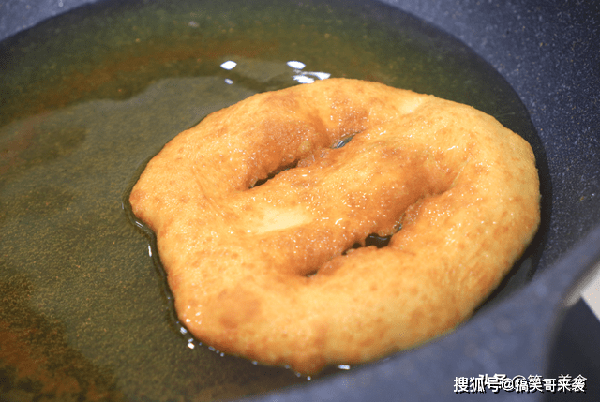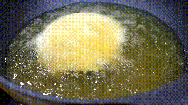 起锅烧油,油温升至160度时把面饼放入锅中,面饼遇热会逐渐鼓起,保持小火炸1分钟左右。