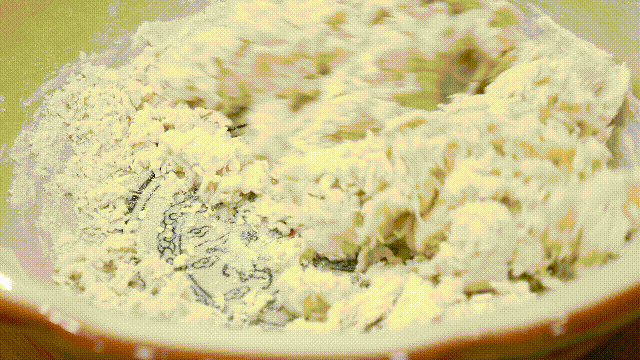 准备面粉200克,加入酵母3克、米酒5克、促进发酵,加入牛奶50毫升,让和出的面更加鲜香、有营养,再倒入60毫升的清水,搅拌至没有干面粉。