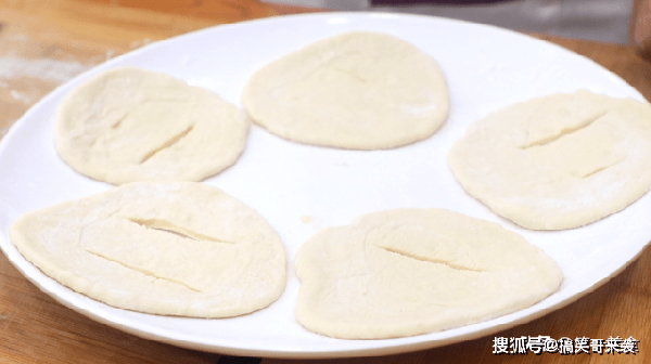 然后用擀面杖擀成半厘米厚的圆形面饼,在面饼上切开两条缝,这样炸制的时候油饼能快速膨胀鼓起,口感更加蓬松。