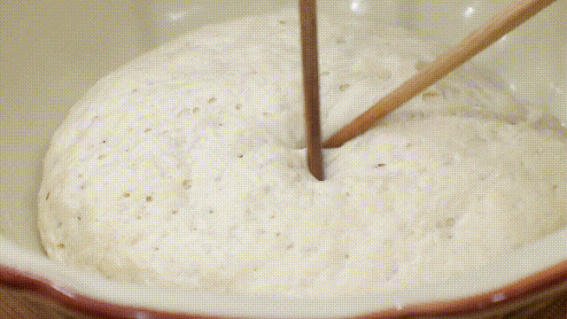 一个小时面粉发酵好以后,用筷子扒开可以看到内部变成了蜂窝状,有千丝万缕相连。