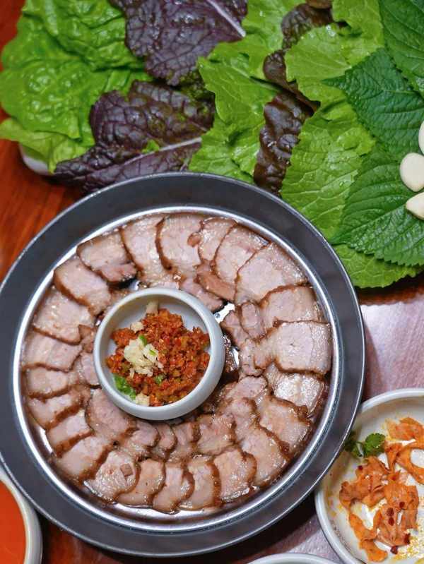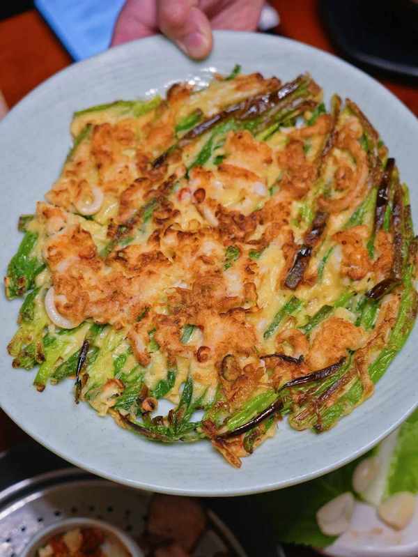 五花肉包饭配了很多种叶子。还有海鲜葱饼和石锅酱汤,几乎每一道都不踩雷。